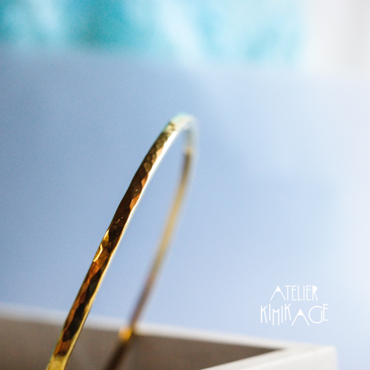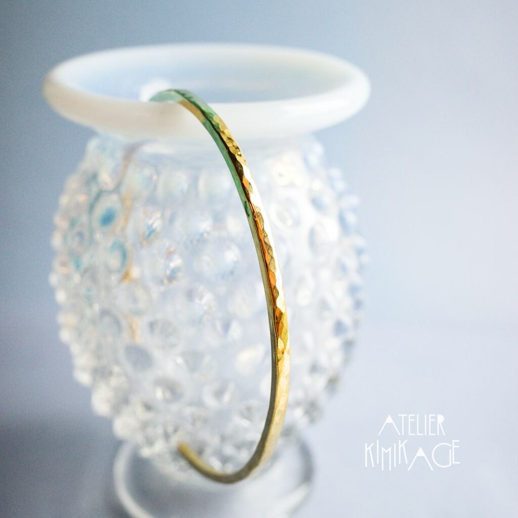 手首に沿うような細身のバングルに、繊細な槌目模様と鏡面仕上げを施しました。